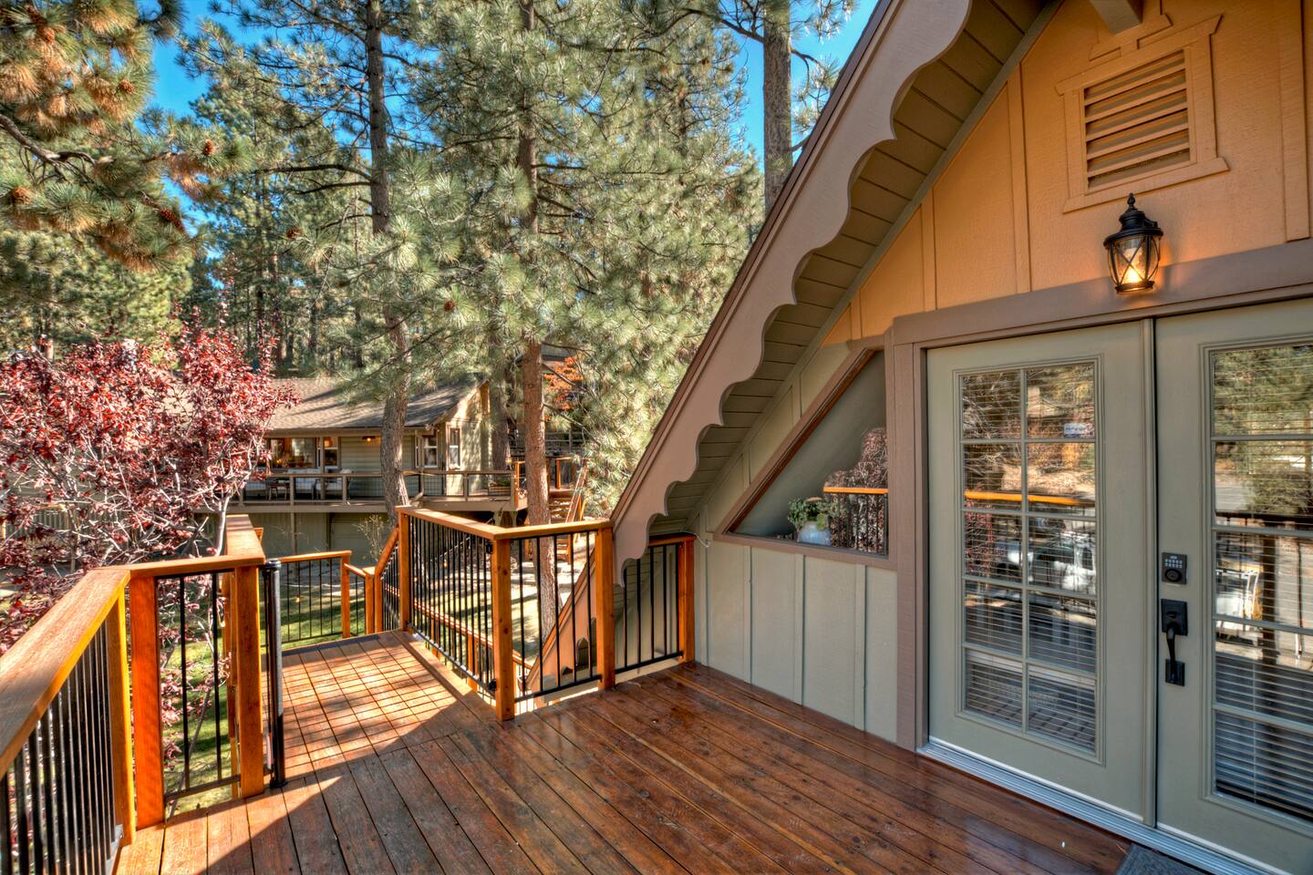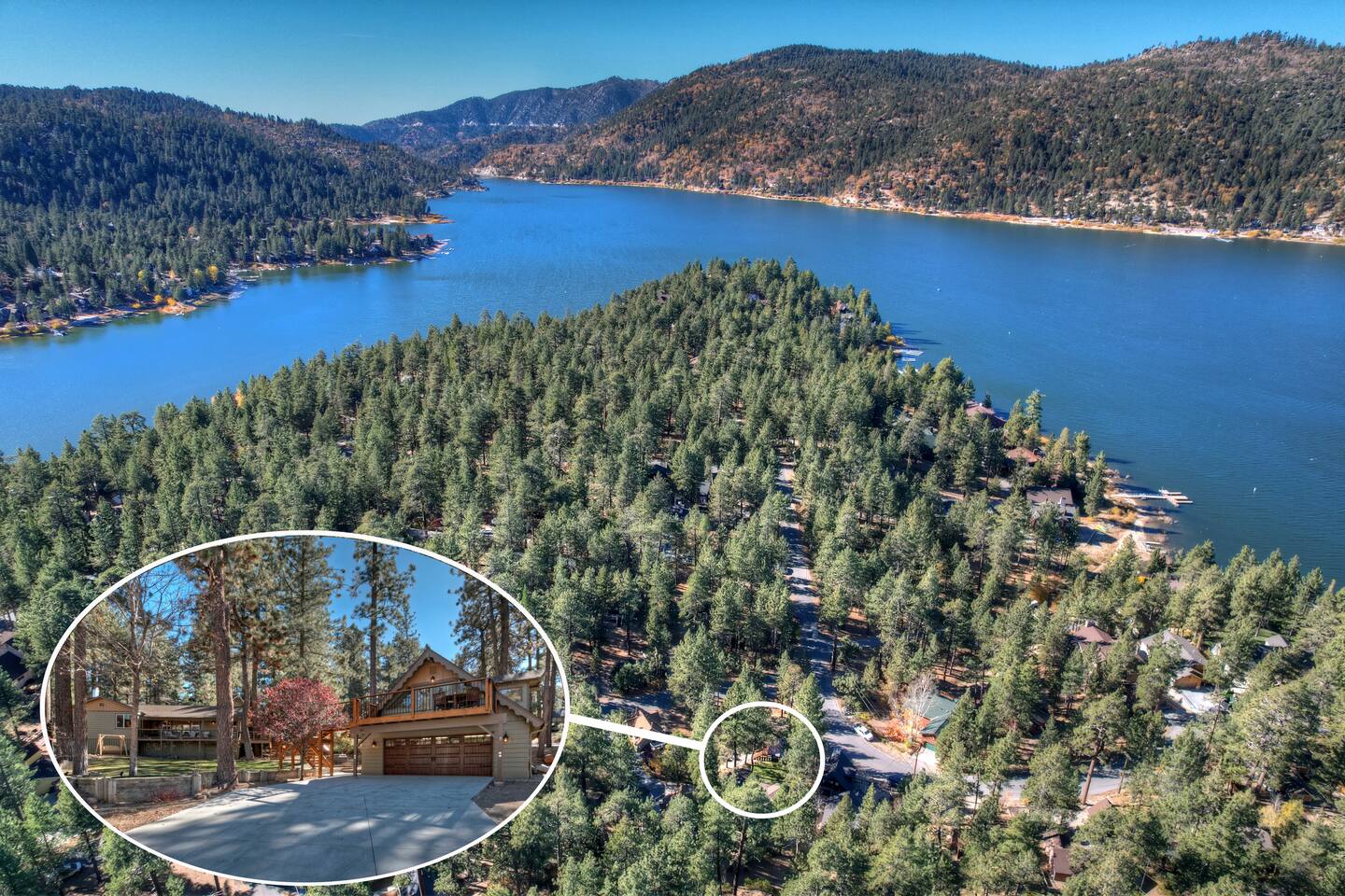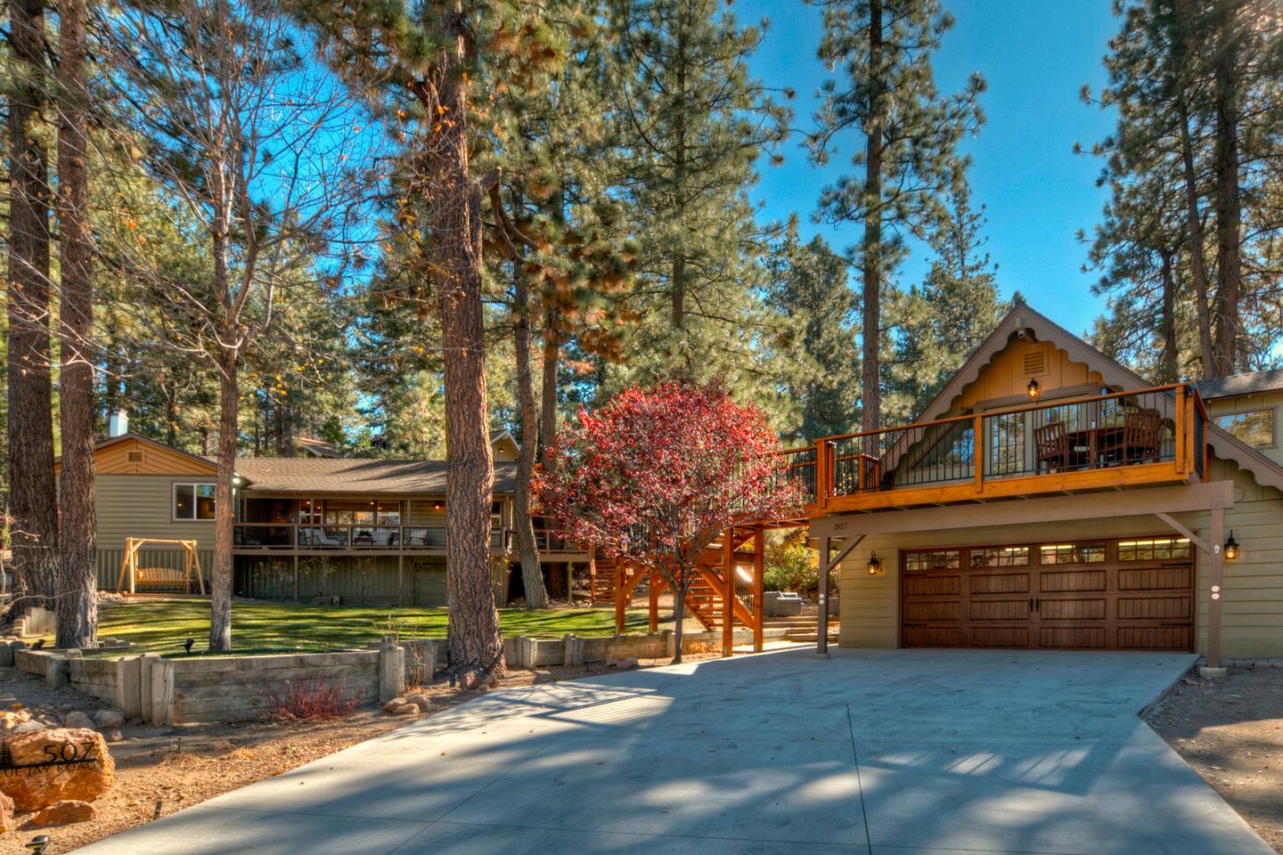 Lodge in Big Bear Lake. Unique layout Main house & detached Guest House in Boulder Bay is perfect for you to share a getaway with family or friends. Stress free parking arrival on a flat driveway for 4 cars (EV plug avail). Cozy living spaces, après-ski lounge in garage w pool table. Unwind outdoors on the decks, roast marshmallows at the fire pit under the stars. Lake access path just across the street, and minutes from The Village, ski resorts, marinas, parks, & hiking. Smoke/vape prohibited